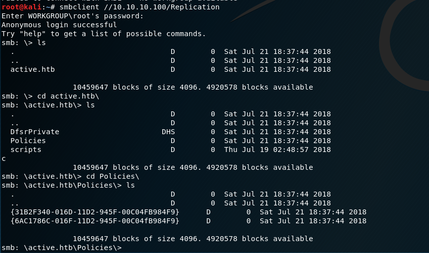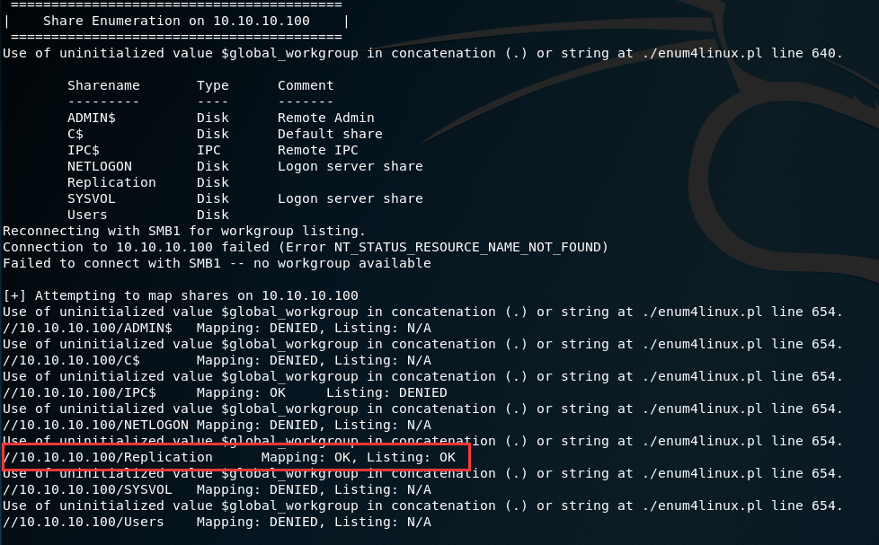 借助[这个连接]里的枚举工具,发现确实存在共享文件夹Replication,供外部人员访问。